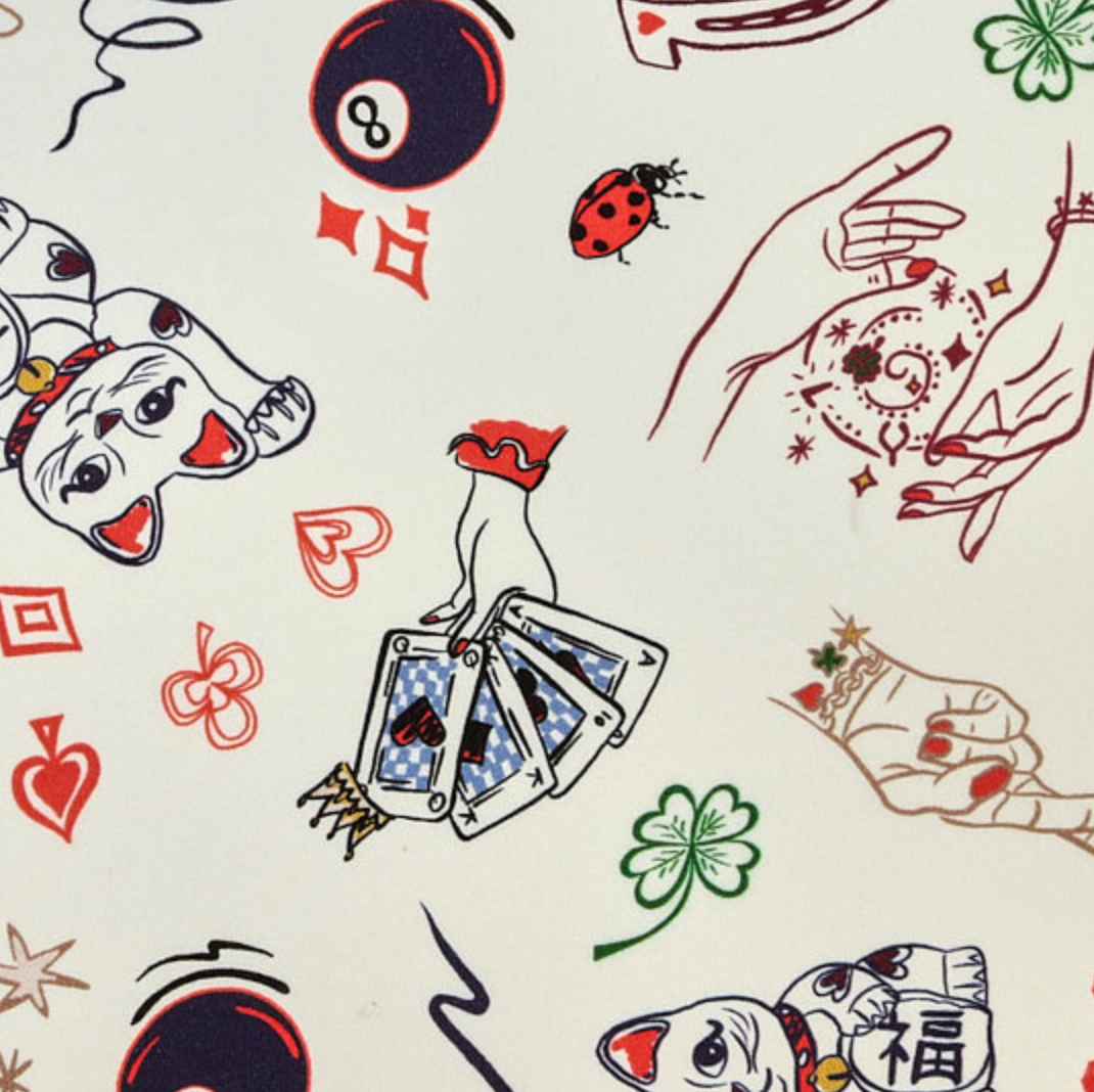 This Fabric Godmother printed viscose dressmaking fabric features fun lucky fortune cats, lucky eight ball, horseshoes, playing cards, dice and four leaf clovers all set against a beautiful ivory background. This print is on a fantastic viscose lawn which is super soft and has a wonderful drape. Perfect for making blouses, dresses and wide leg trousers