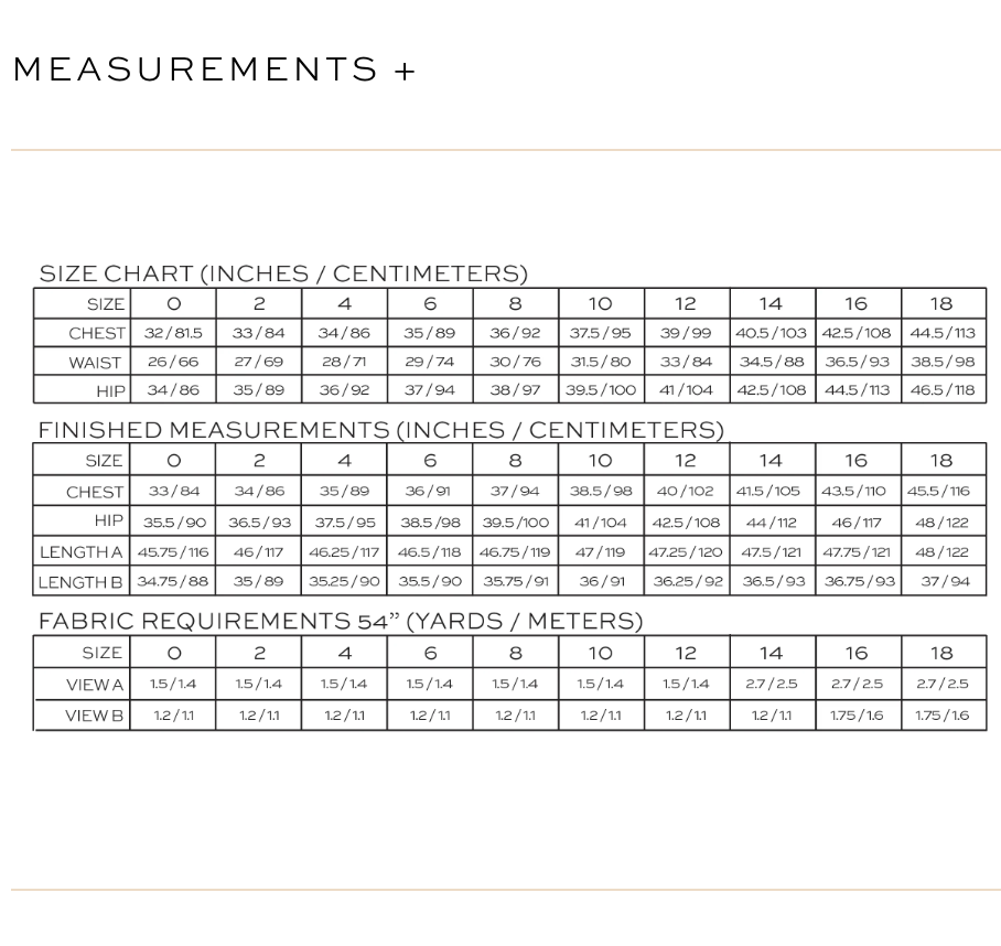 The Lodo pattern is an elevated take on a basic t-shirt dress. It has a straight fit through the waist and hips and a slightly tapered hem to create a subtle cocoon shape. It has a V neck at centre front and an extended cap sleeve. Both the neckline and armholes are finished with a woven facing for stability and structure. View A has a hem that hits at mid calf with a slit at centre back for move ability. View B’s hem hits a couple of inches above the knee.