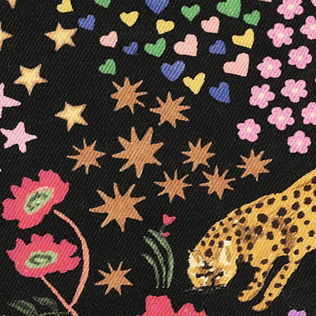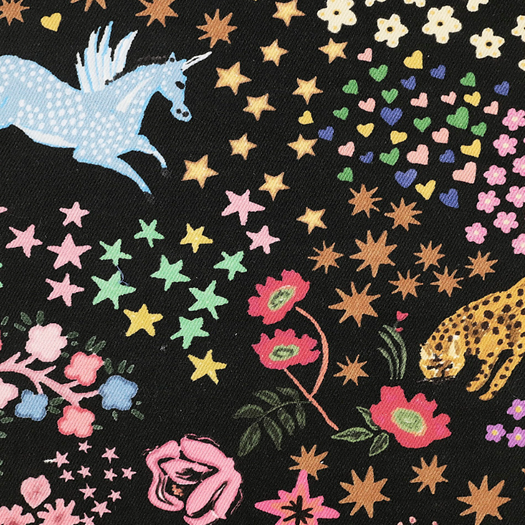 A Fabric Godmother exclusive design printed onto the most wonderful quality denim dressmaking fabric. This dressmaking fabric evokes a sense of magic and wonder with mythical animals, tigers and celestial symbols set in a magical floral forest.